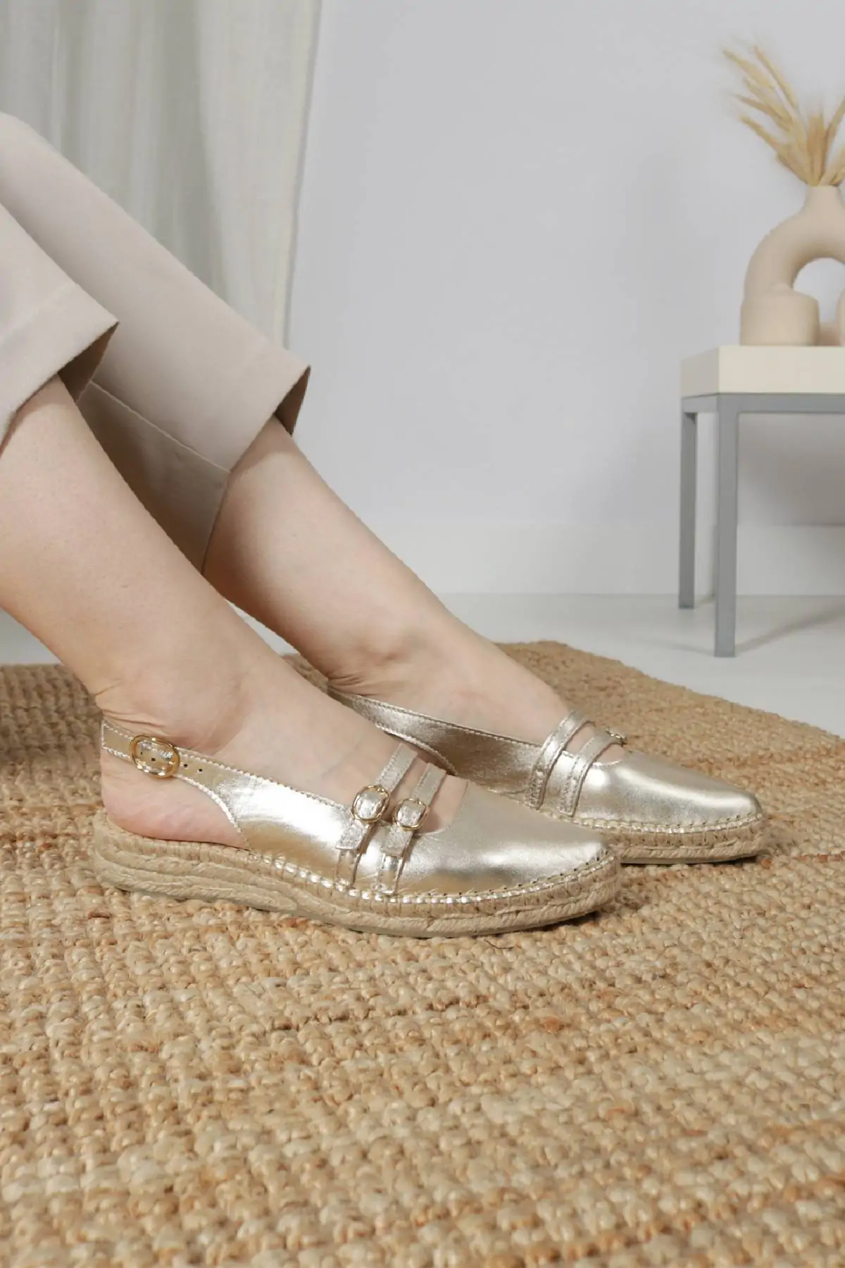 Golden flat espadrilles buckle detail
