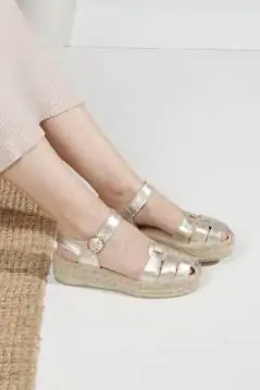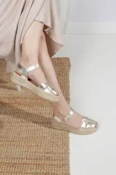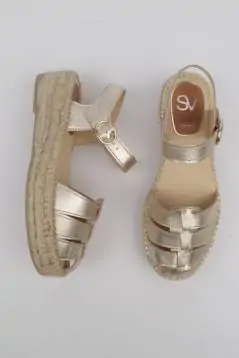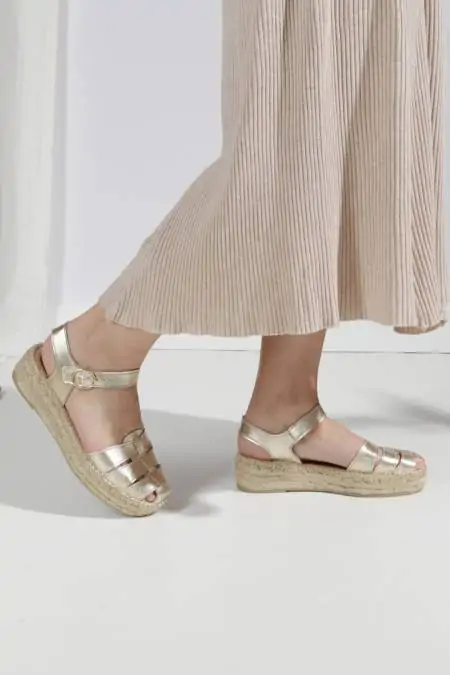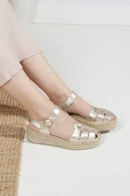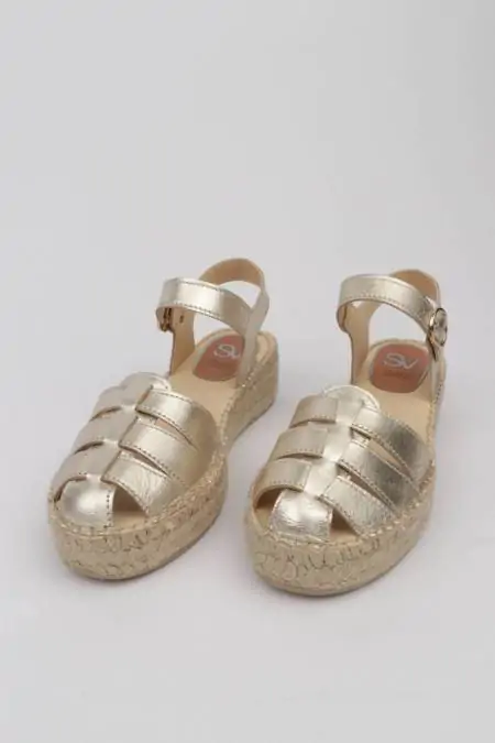 ¡Las alpargatas doradas más especiales y cómodas de la temporada! Descubre en estas alpargatas doradas de estilo cangrejera tu calzado cómodo para verano, es una alpargata de planaforma que no deja indiferente a nadie, y resultan ideales para lucir bronceado con todos tus looks este verano, las podrás llevarlas con todos tus vestidos favoritos. Tienen puntera redondeada, con piso de trenza de esparto doble y una pequeña cuña de 4 cm. total de altura, con plantillas acolchadas para un extra de comodidad, el diseño de la hebilla sobre el empeine proporciona un ajuste personalizado. Las alpargatas para mujer de Calzados Salvi son uno de los productos estrella en nuestra alpargatería de Madrid, y también en la zapatería online, unas alpargatas cómodas elaboradas artesanalmente en España.