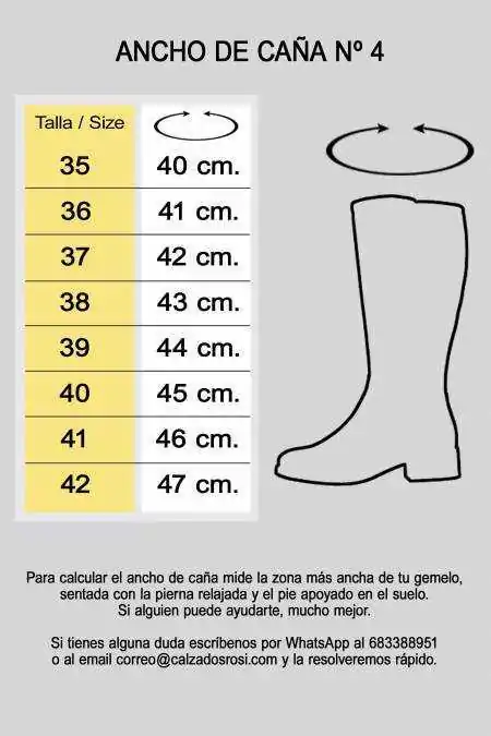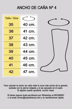 Tiene ancho de caña nº 4. ¿Sabes cuál es tu ANCHO DE CAÑA perfecto?, mide la zona más ancha de tu gemelo, sentada con la pierna relajada y el pie apoyado en el suelo. Con la medida resultante consulta la TABLA DE MEDIDAS.