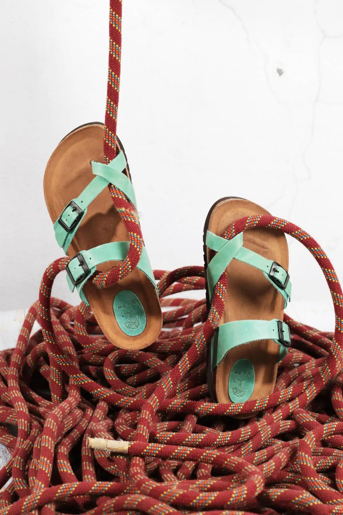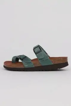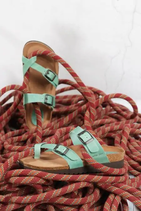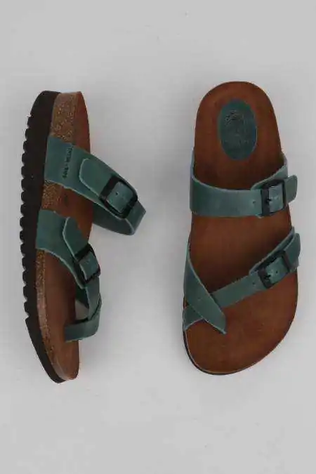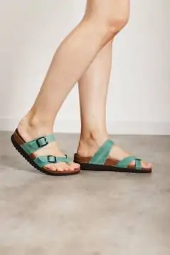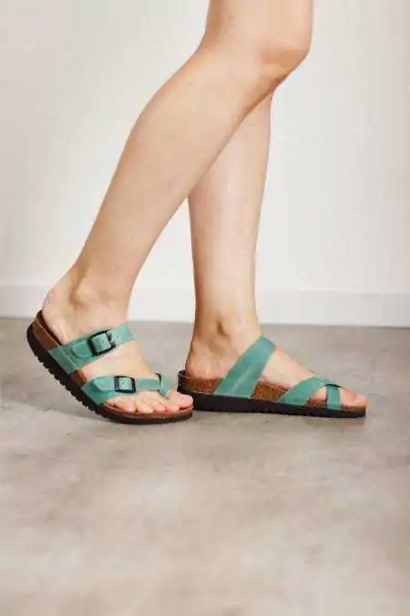 Con tira cruzada entre dedos y otra en el empeine, las dos ajustadas con hebillas.